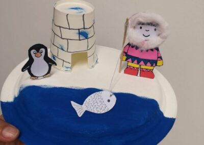 L’après-midi, nous avons fabriquer le décor de la banquise pour y planter notre Inuit à côté de son igloo ! 🥶